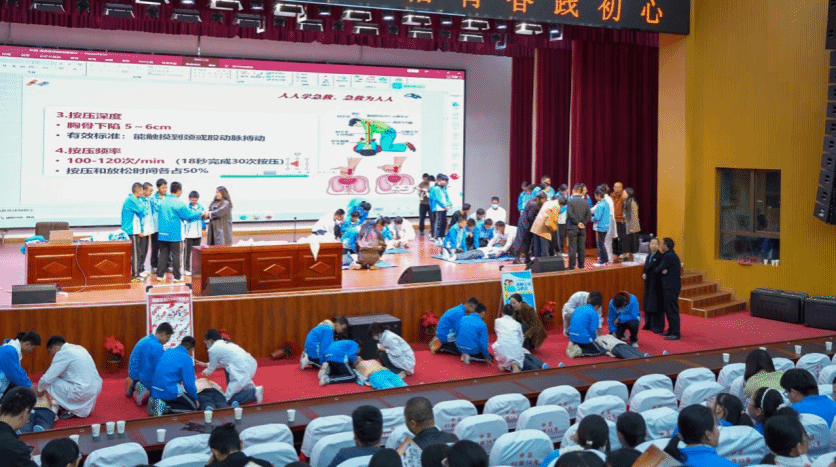 护理学院危重症护理团队党员骨干教师通过“理论讲解 + 实操演示 + 分组实训”的形式,对现场思源实验学校学生开展心肺复苏、创伤包扎、窒息抢救等常用急救技能培训。党员教师分组指导学生实操,现场氛围热烈,学生们踊跃尝试、互相点评,强化了学生安全防护意识,提升了自身急救技能。