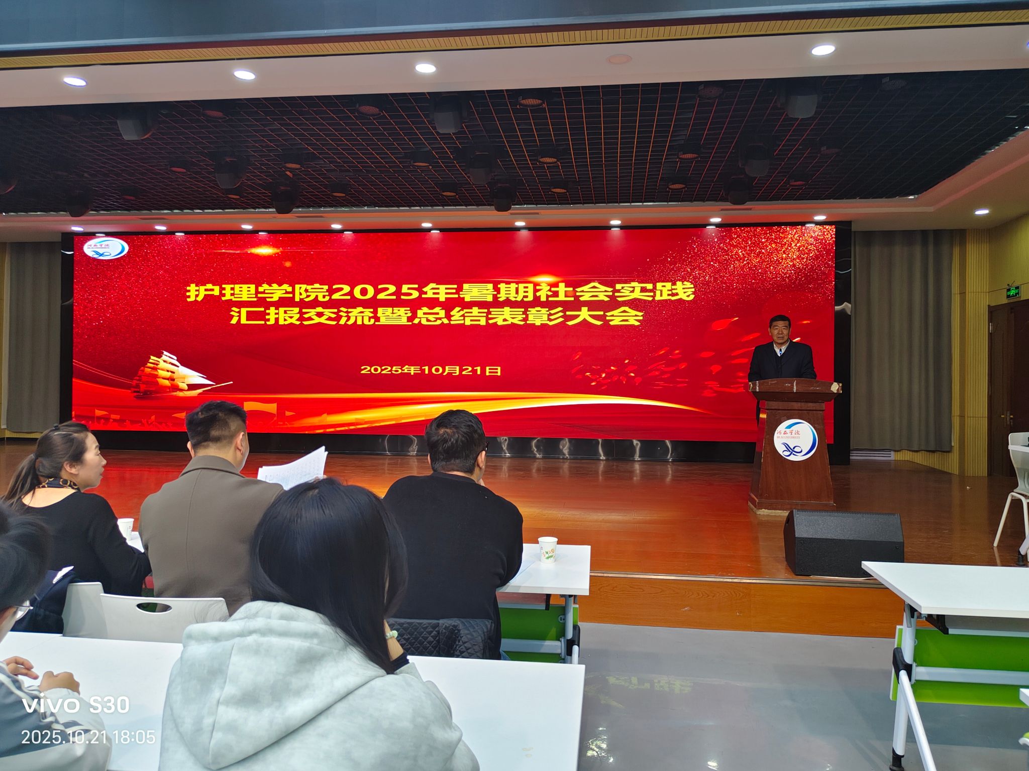 10月21日,护理学院举办2025年暑期社会实践汇报交流会暨总结表彰大会。学院负责人、辅导员、社会实践指导教师代表及200多名学生代表参加。